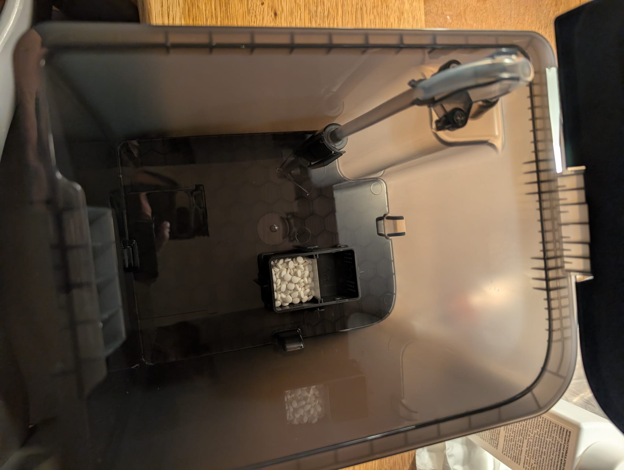 Ein positives Detail ist mir im Frischwasserbehälter aufgefallen: Dort befindet sich ein kleines Fach mit Tabletten, die in der Anleitung seltsamerweise nicht näher beschrieben werden. Es handelt sich dabei um Wasserenthärter, die Kalkablagerungen im System entgegenwirken sollen – ein Feature, das bei Bedarf offenbar aufgefüllt werden kann. Wie lange eine Füllung hält und ob man dies irgendwann auch Beachtung schenkt, bleibt abzuwarten. Dennoch ist es eine spannende Neuerung: Bei anderen namhaften Herstellern wie Dreame, Roborock oder Ecovacs habe ich eine solche integrierte Lösung bisher noch nicht gesehen.