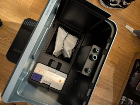 Der Aufbau gestaltete sich denkbar einfach: Lediglich die Auffahrrampe der Station musste montiert sowie der Staubbeutel und die Reinigungslösung eingesetzt werden. Letzteres führt mich jedoch zu einem ersten, wenn auch kleinen Kritikpunkt am Design-Konzept. Um die Optik der Vorderseite ‚clean‘ zu halten, wurden das Fach für den Staubbeutel und der Schacht für die Reinigungslösung unter den beiden Wassertanks platziert. Das sieht zwar schick aus, bringt aber den Nachteil mit sich, dass man die Tanks erst entnehmen muss, wenn man an den Beutel oder die Chemie möchte.