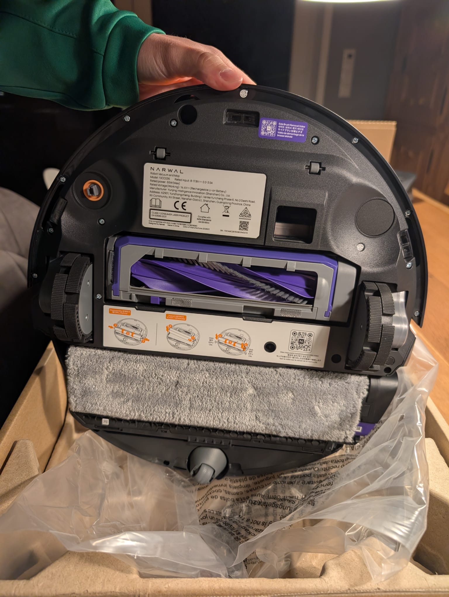 Beim Roboter selbst muss nur die Seitenbürste angebracht werden. Der Wischmopp, sowie die Hauptbürste sind bereits vollständig installiert.