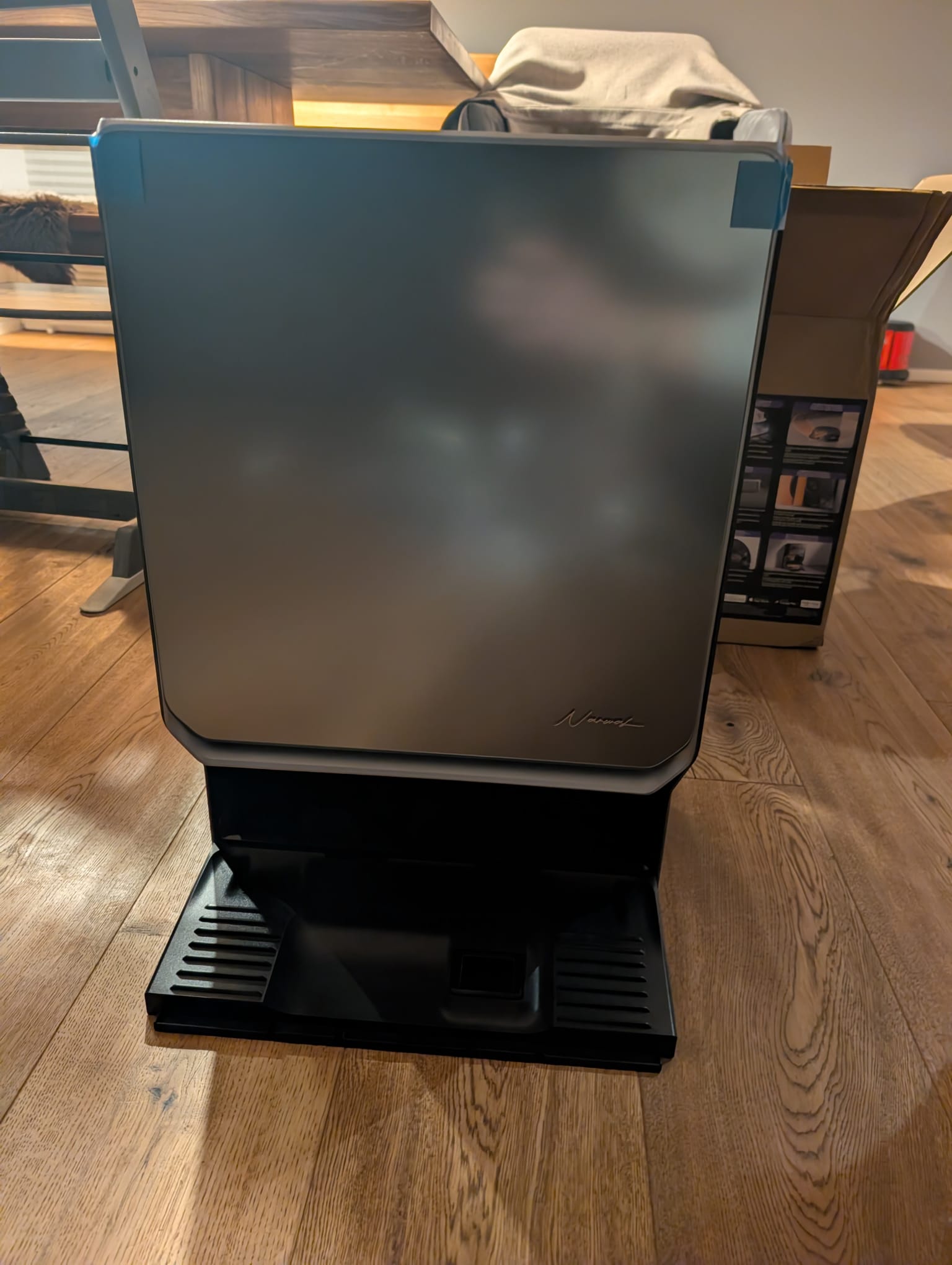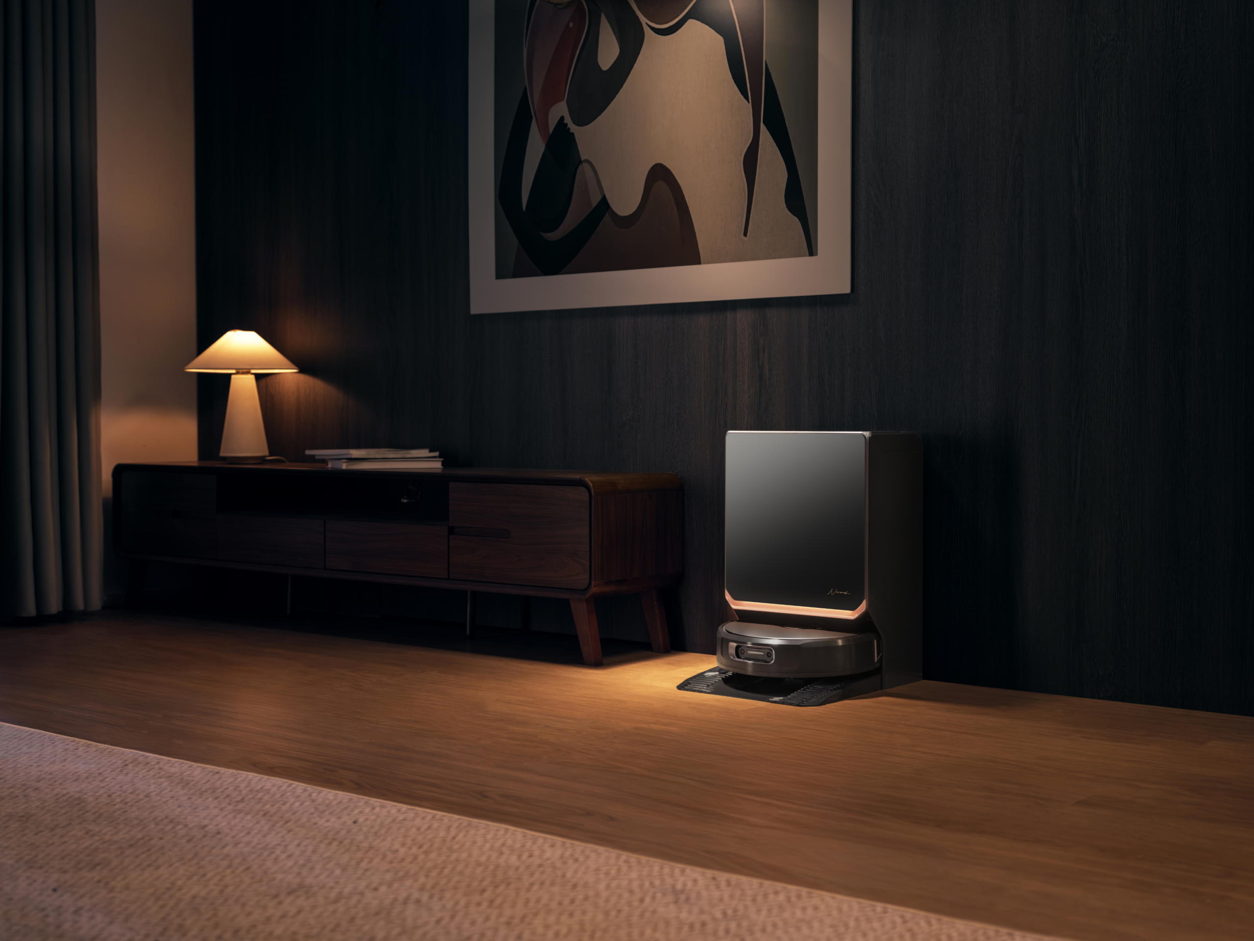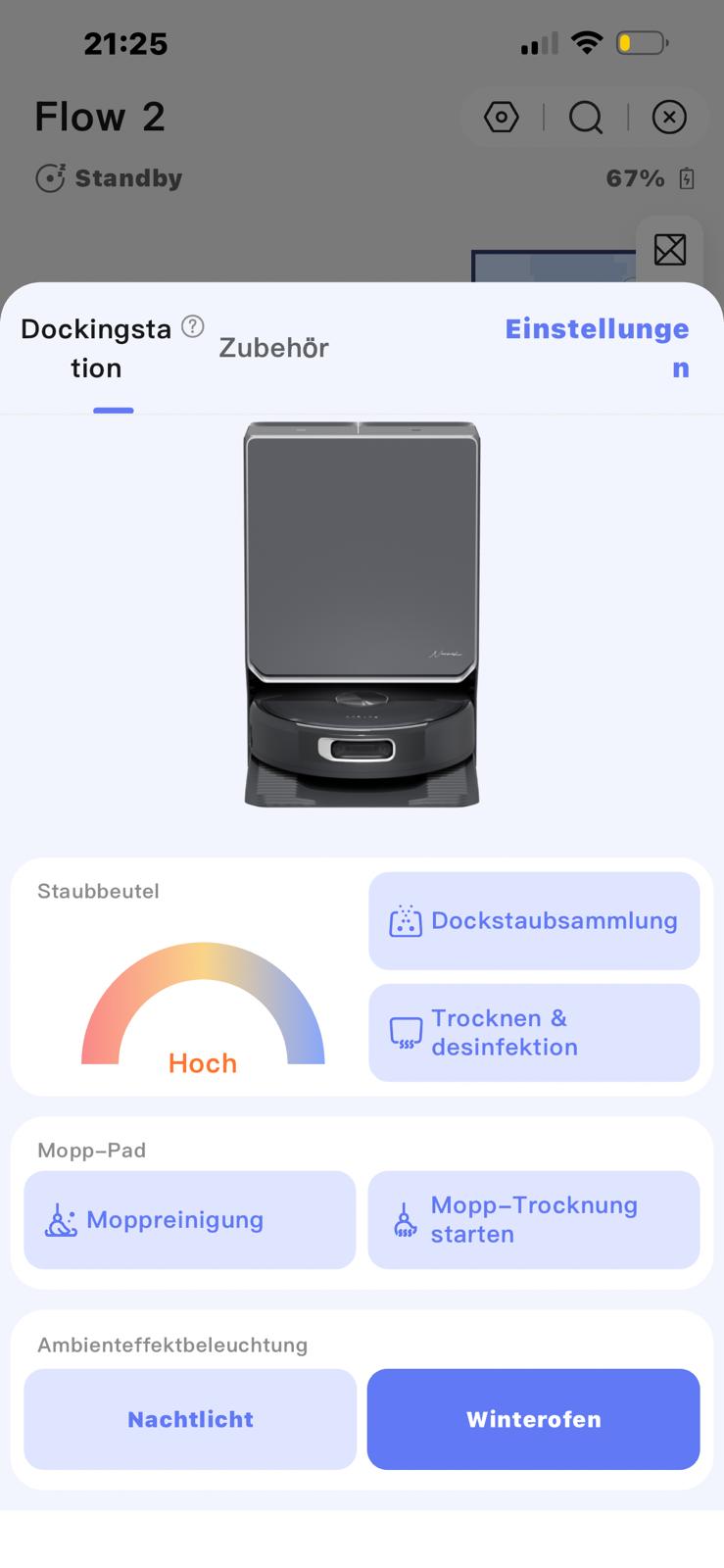 Auch die Basisstation bietet einen Mix aus praktischen Funktionen und optischen Spielereien. Zu den nützlichen Standards gehören die manuelle Mopp-Reinigung, das Absaugen des Staubbehälters sowie die Trocknungs- und Desinfektionsfunktion für den Staubbeutel. Ein echtes Highlight für die Optik ist das integrierte Ambientelicht. Aktuell beschränken sich die Modi zwar noch auf „Nachtlicht“ und „Winterofen“, doch ich habe bereits bei Narwal nachgehakt: Möglicherweise folgen bald weitere Optionen oder sogar eine komplett freie Farbwahl per Update. Das würde das Design-Konzept natürlich perfekt abrunden.