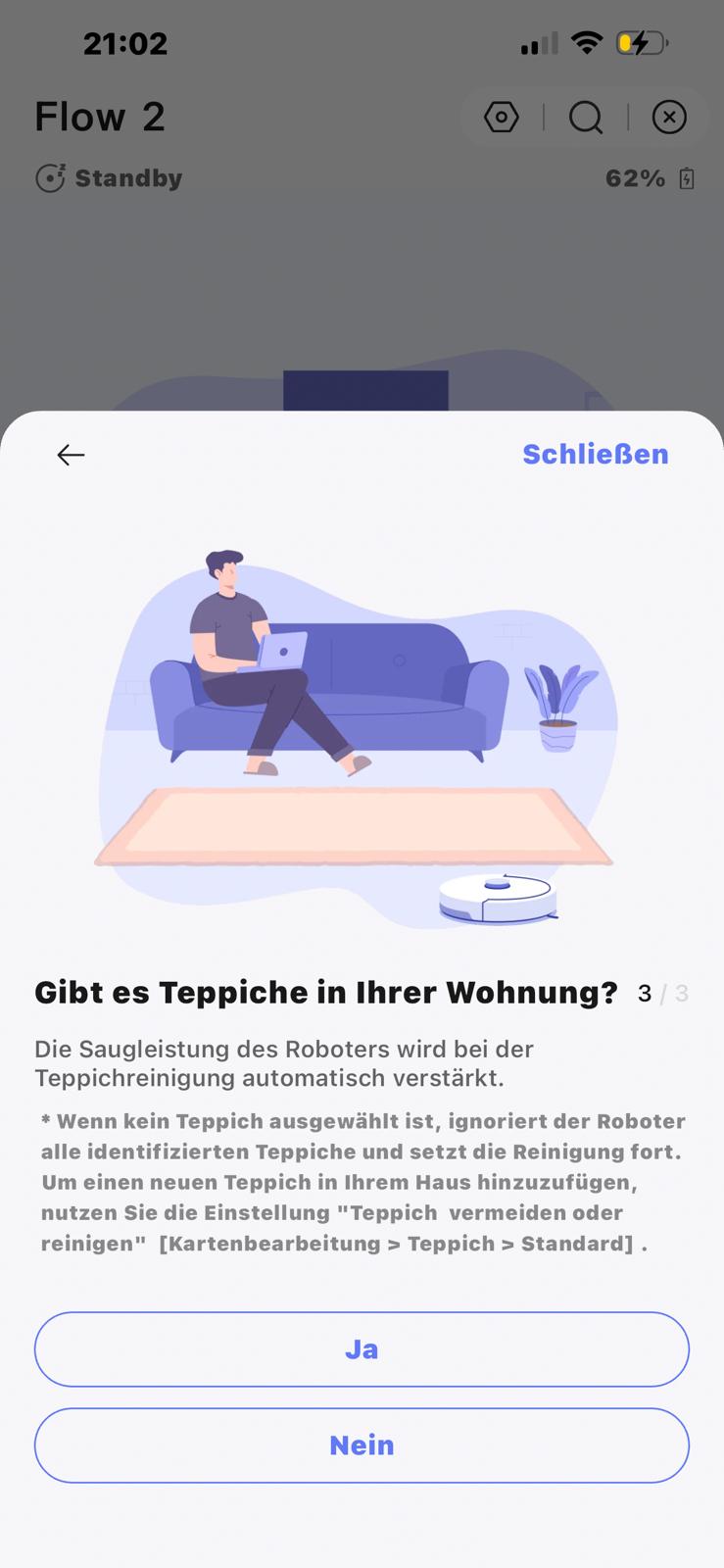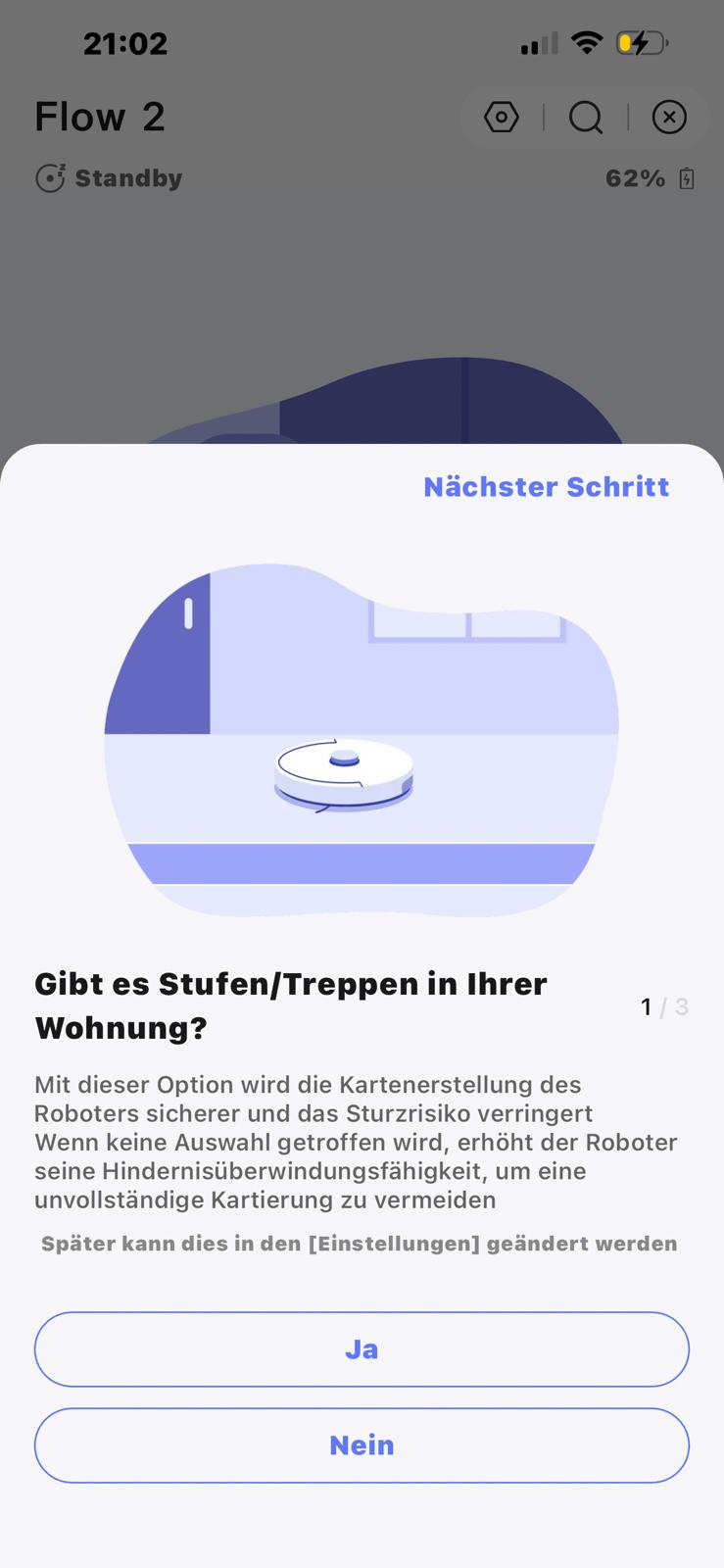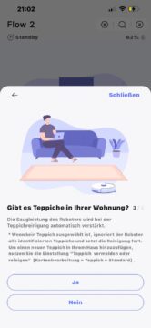 Die Kartierung ist bei Narwal wirklich angenehm gelöst. Bevor es losgeht, führt die App einen kurzen Check durch: Gibt es Treppen im Haushalt? Das ist sinnvoll, damit der Robbi keinen Abgang macht, wenn er versucht, Erhöhungen zu erklimmen. Zudem will die App wissen, ob Teppiche im Spiel sind, um die Saugleistung passend zu konfigurieren. Die Teppich-Frage ist zwar ein netter Service, wirkt aber fast etwas redundant, da der Roboter das während der Fahrt normalerweise auch ganz allein merken sollte. Dennoch: Ein guter Ansatz, um Fehler von vornherein auszuschließen.