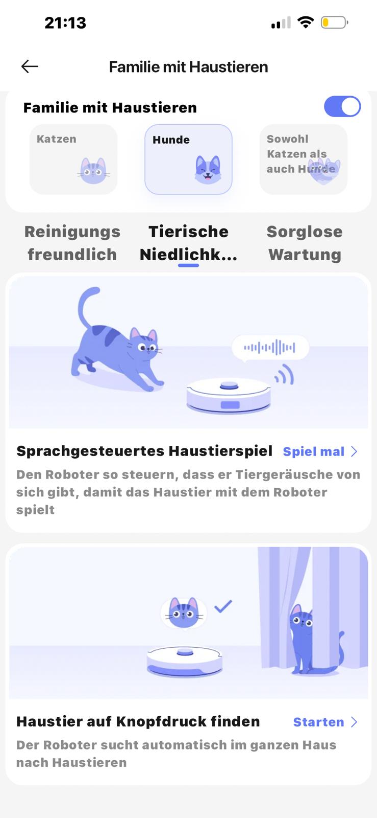 Völlig kurios wird es bei den Entertainment-Funktionen: Der Roboter kann tatsächlich Lieder und Geräusche abspielen, um mit den Haustieren zu interagieren. Es gibt sogar einen Modus, in dem er ohne Reinigungsfunktion durch das Haus fährt, nur um das Tier zu suchen. Eine nette Spielerei, die man sicher nicht zwingend braucht. Ob man das im Alltag wirklich nutzt? Ich wage es zu bezweifeln.