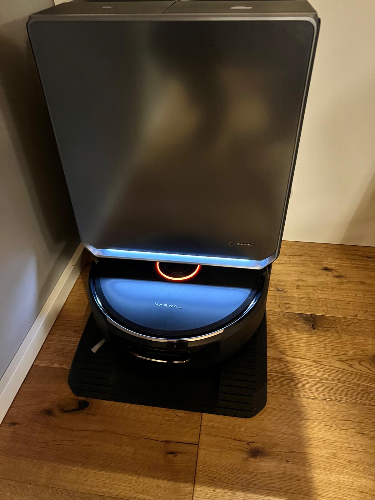Sobald alles an Ort und Stelle platziert ist, kann es auch schon losgehen: Strom an, Roboter in die Station schieben – und direkt folgt das optische Highlight. Die LED-Leiste an der Front des Roboters erwacht zum Leben und sieht wirklich gut aus. Es ist ein kleines Detail, das den schicken Design-Eindruck aber sofort unterstreicht.