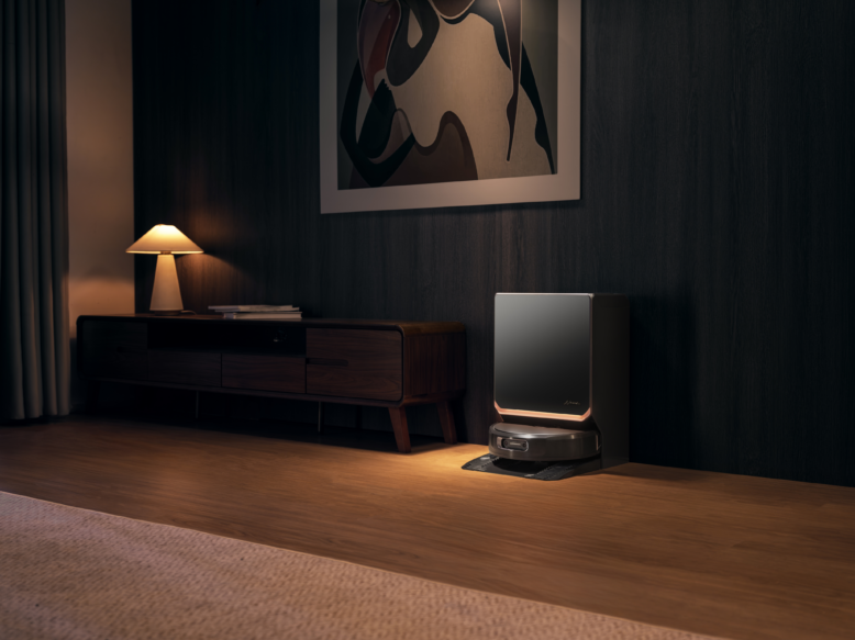 Das herausragende Merkmal des Flow 2 ist zweifelsohne sein Design. Der Verzicht auf den klassischen LiDAR-Turm ermöglicht nicht nur eine extrem cleane Optik, sondern sorgt auch für eine geringe Bauhöhe von nur 95 mm. Damit reinigt der Roboter auch unter Möbeln, an denen viele andere Modelle scheitern würden. Die Station fügt sich mit ihrem Ambientelicht nahtlos in moderne Wohnumgebungen ein, wobei die „versteckte“ Platzierung von Staubbeutel und Reinigungsmittel unter den Wassertanks zwar optisch überzeugt, im Alltag jedoch einen kleinen Kompromiss beim Bedienkomfort (Entnahme der Tanks) fordert.