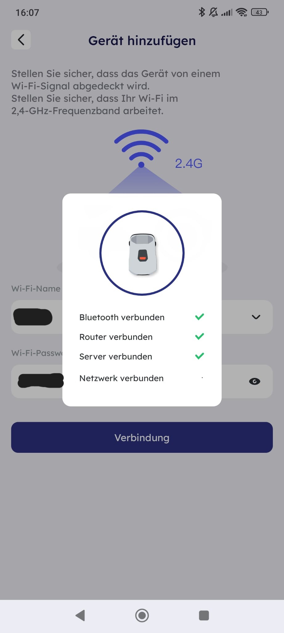 Im Anschluss erfolgt die Einbindung in das heimische Netzwerk durch die Eingabe der WLAN-Daten. Hierbei zeigt sich ein negativer Punkt des Genie 800, da dieser ausschließlich das 2,4-GHz-Frequenzband unterstützt. Während 2,4 GHz zwar den Vorteil einer höheren Reichweite bietet, was im Gartenbereich durchaus nützlich sein kann, fehlt die Unterstützung für das modernere 5-GHz-Band. Eine Dual-Band-Lösung wäre hier zeitgemäßer gewesen, da das 5-GHz-Netz oft stabilere Datenübertragungen ermöglicht und im Jahr 2026 eigentlich zum Standard gehört. Die N- und M-Serie soll aber laut Ansprechpartner 5 GHz unterstützen.