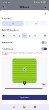 Über die App lassen sich wesentliche Parameter zur Optimierung des Ergebnisses individuell festlegen. Besonders hervorzuheben ist die Möglichkeit, die Bahnbreite zu definieren. Durch eine engere Einstellung der Bahnen wird der Rasen besonders gründlich bearbeitet, was die Bildung von stehengebliebenen Halmen minimiert. Auch die Schnitthöhe lässt sich bequem und stufenlos über die Anwendung steuern, sodass eine schnelle Anpassung an die jeweilige Rasenbeschaffenheit möglich ist.