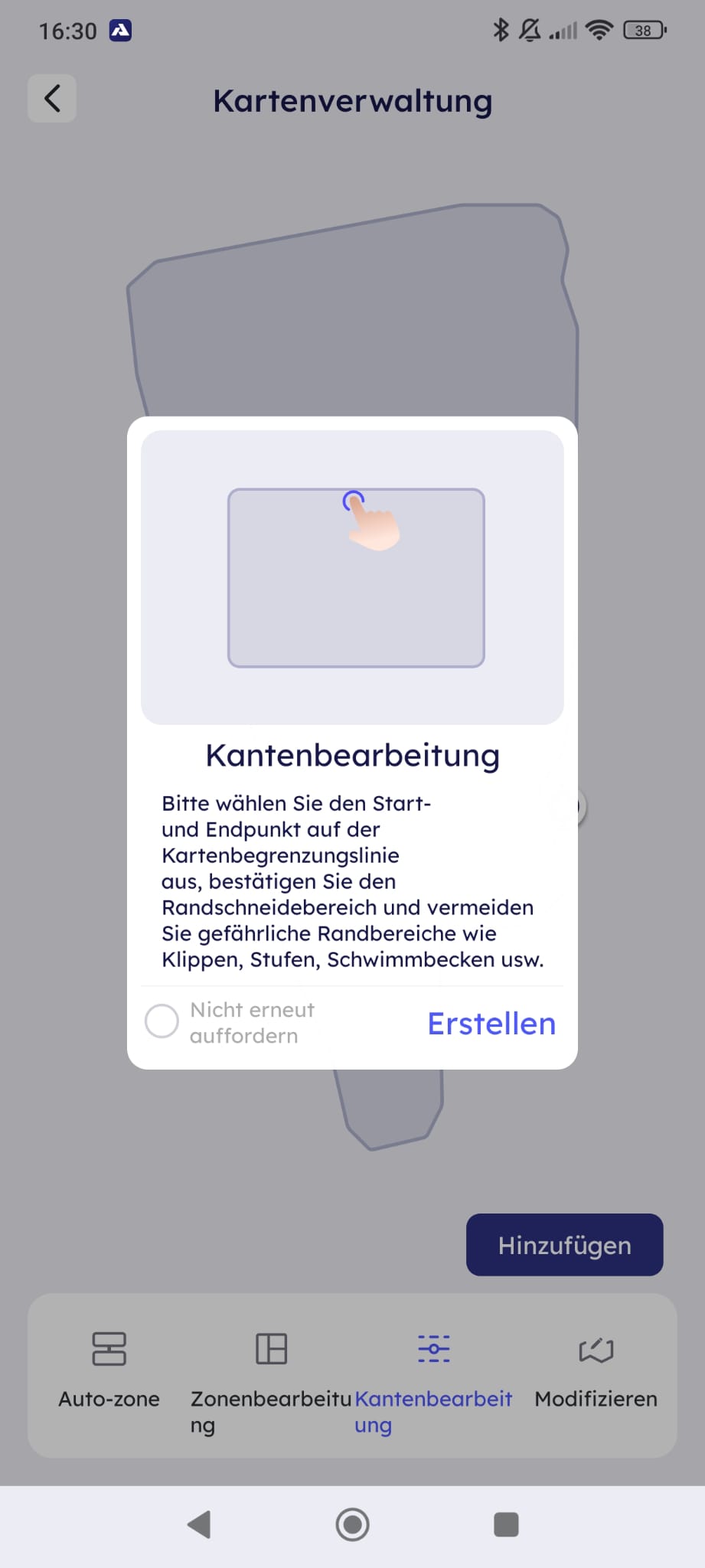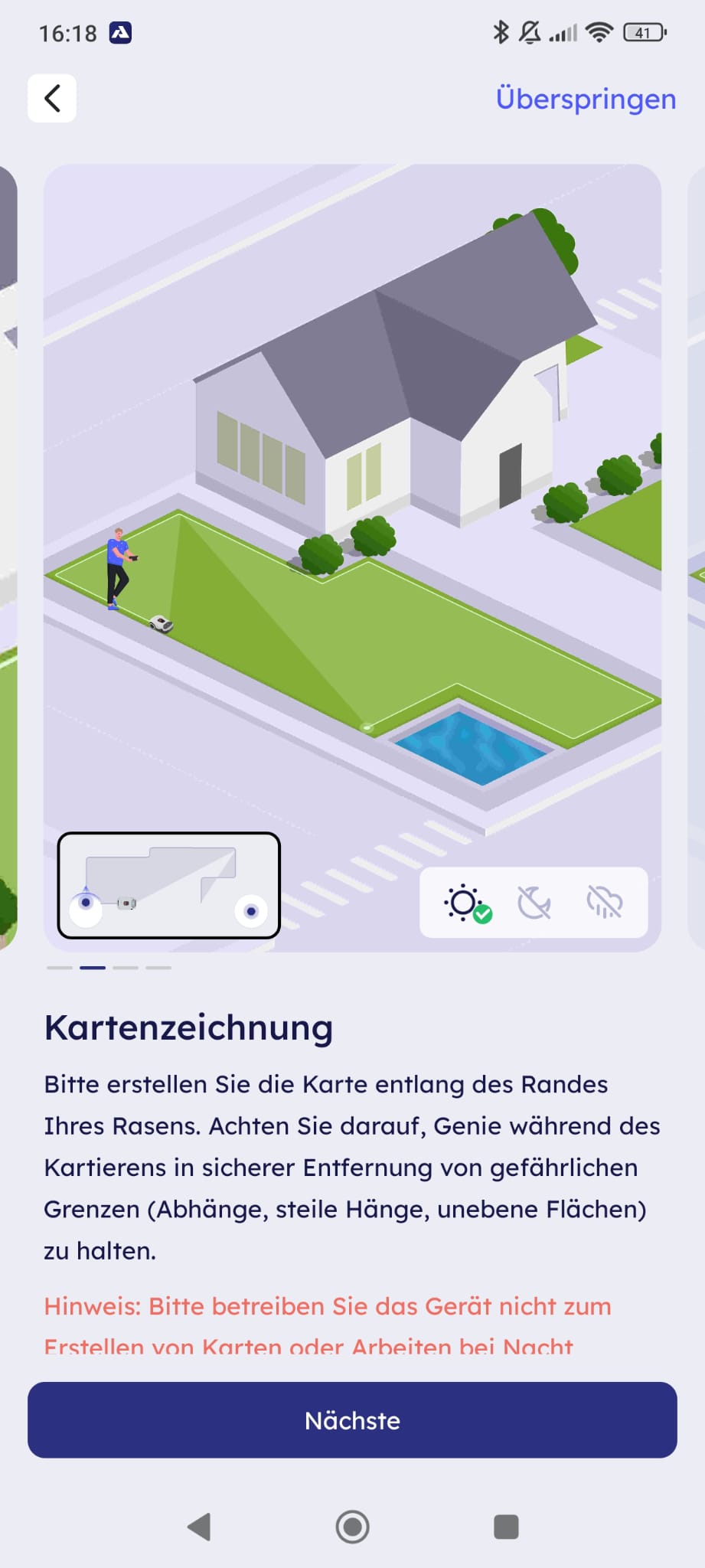 Die Kartierung des Gartens stellt einen der zentralen Aspekte bei der Einrichtung dar, da der Roboter hierdurch seine Arbeitsbereiche definiert. Dem Nutzer stehen dabei zwei Optionen zur Verfügung: die automatische Kartierung oder das manuelle Abfahren der Rasenkante.