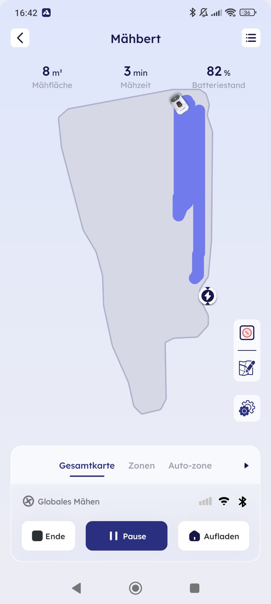 Zudem traten Unregelmäßigkeiten bei der Anzeige der bereits gemähten Fläche auf. Die Darstellung des Mähverlaufs lud oft erst zeitverzögert nach dem Öffnen der App neu. Dies erschwerte es teilweise, die bereits bearbeiteten Bereiche nachzuvollziehen, da die entsprechenden Markierungen nicht unmittelbar zur Verfügung standen.