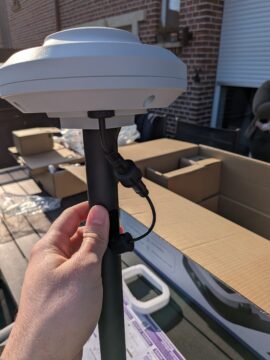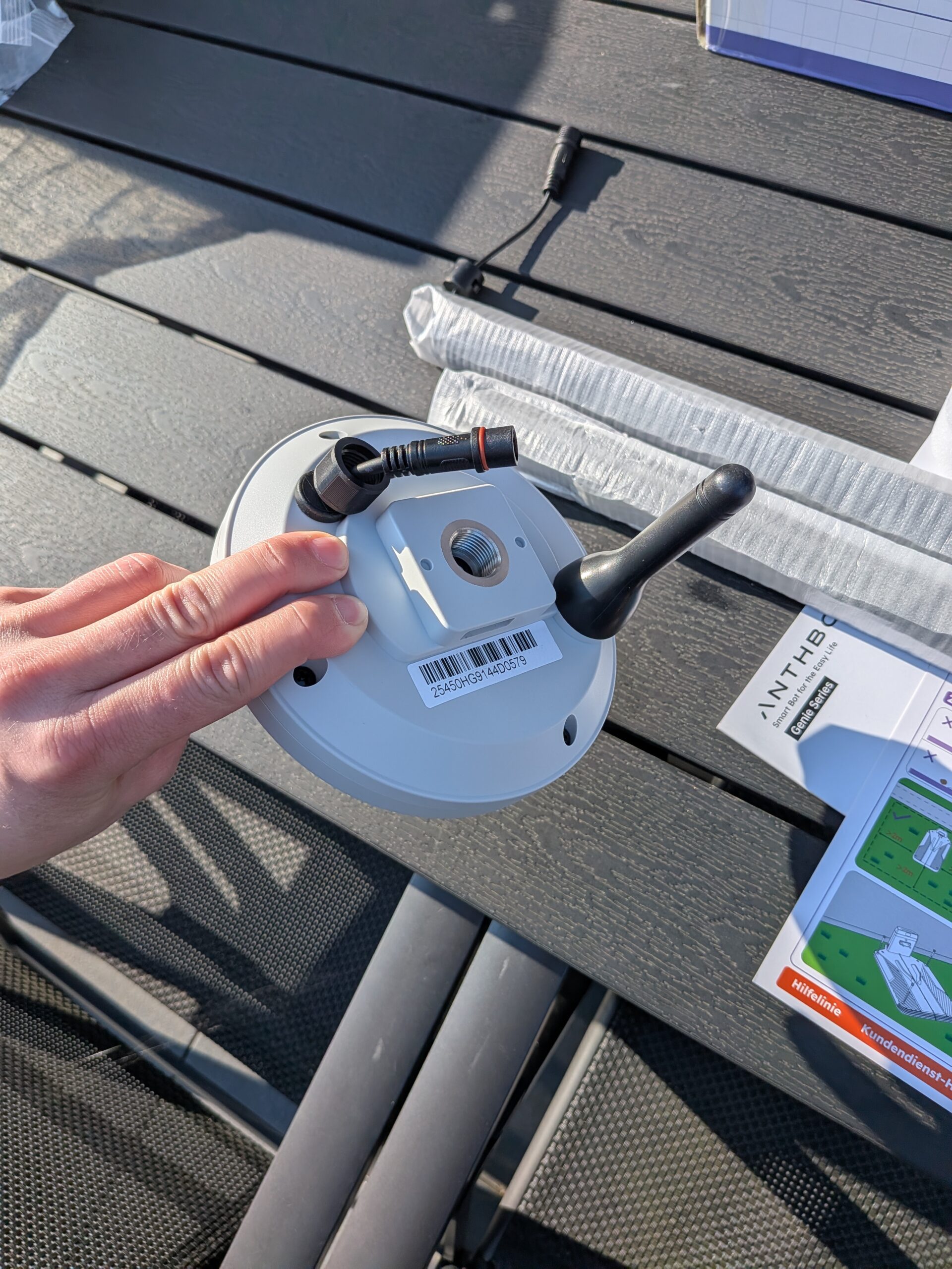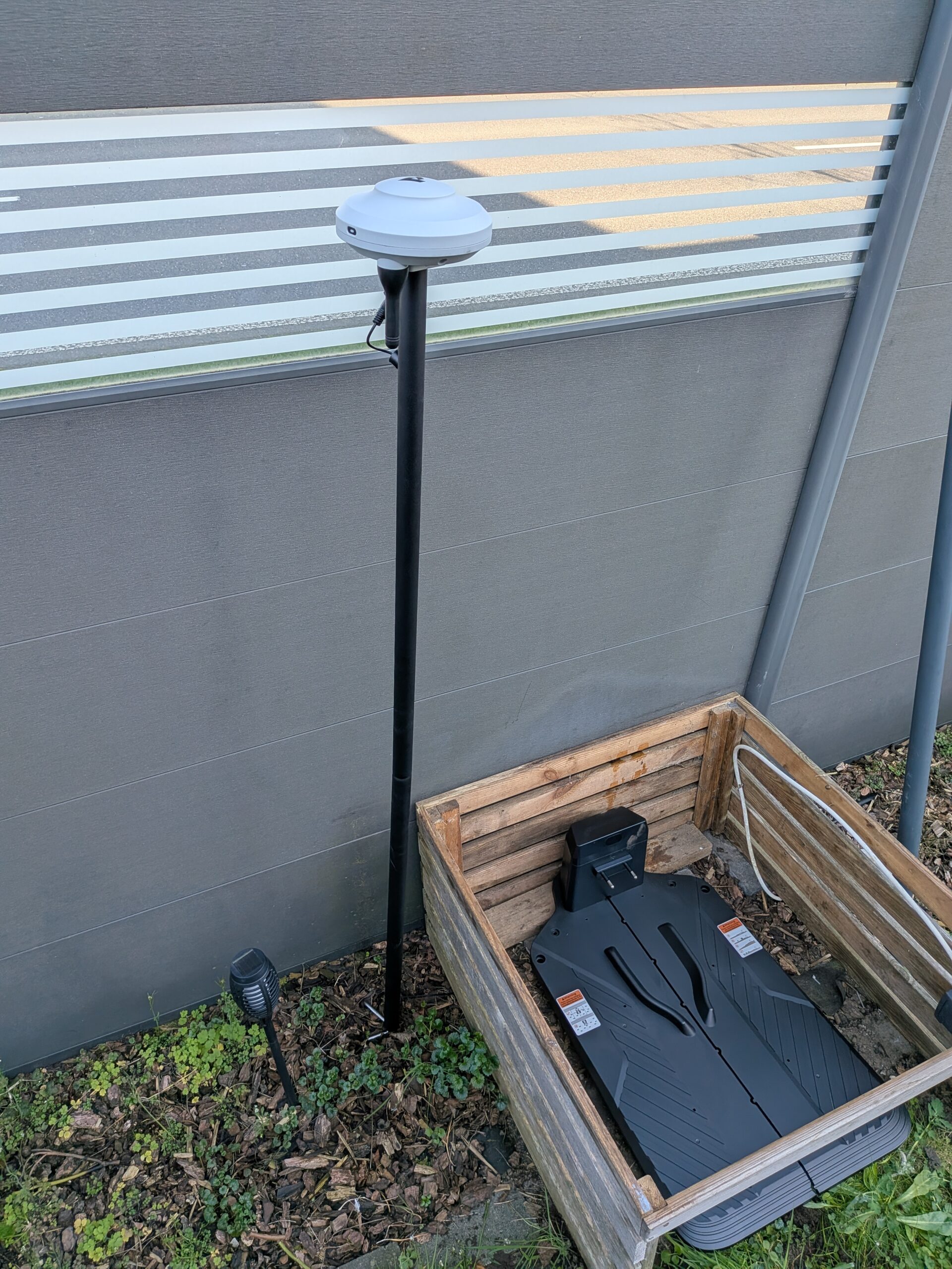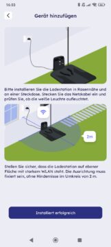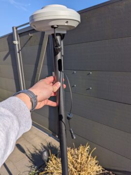 Die Montage der RTK-Antenne erfolgt durch Verschrauben der Einzelteile. Im Gegensatz zu Lösungen anderer Hersteller, die optionale Wandhalterungen anbieten, ist diese Version wohl nur für den stehenden Betrieb konzipiert. Eine Besonderheit ist die ortsgebundene Installation: Sowohl die Dokumentation als auch die App geben vor, dass die Antenne in unmittelbarer Nähe zur Ladestation platziert werden muss. Eine räumlich getrennte Positionierung scheint nicht vorgesehen.