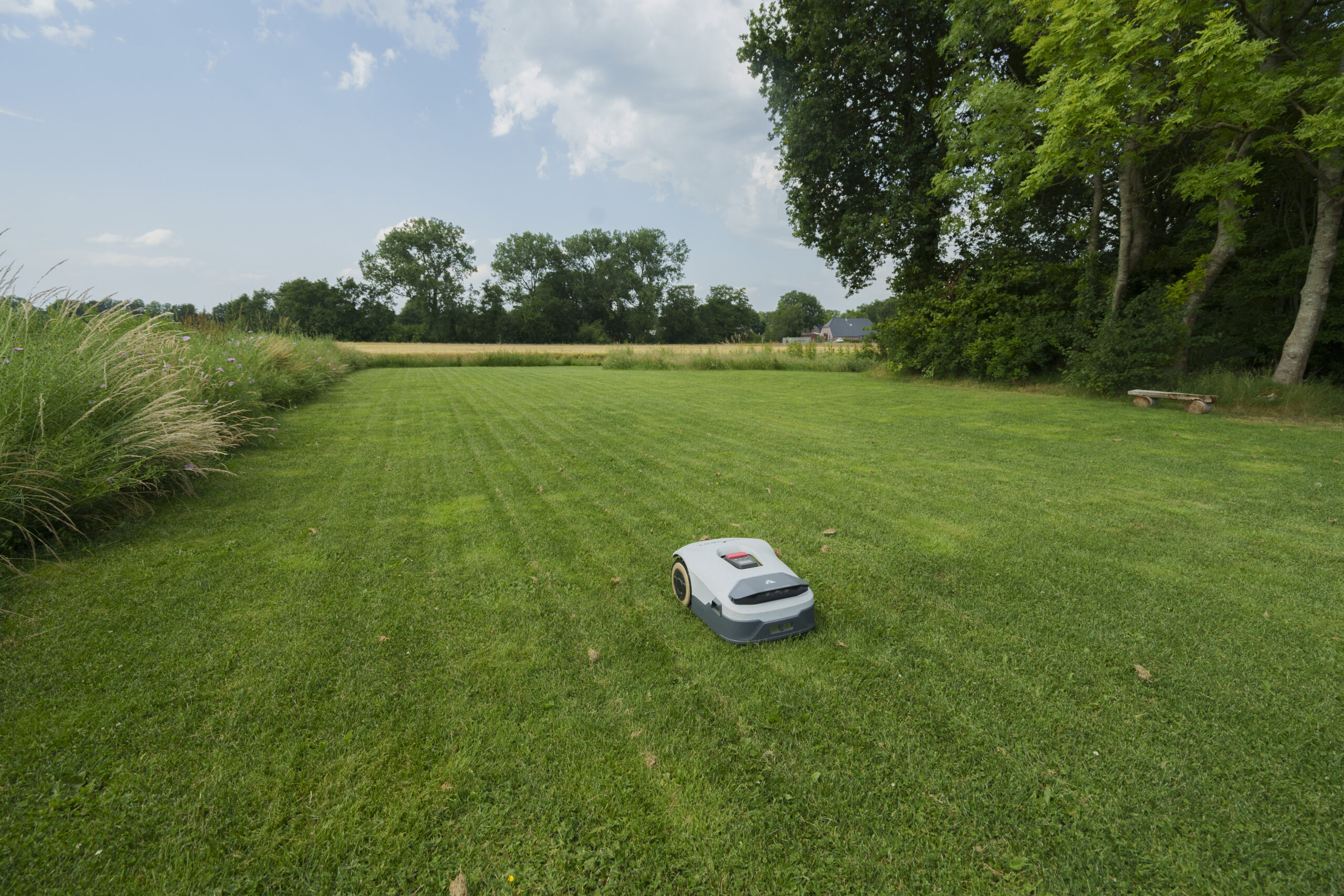 Der Testrasen glich zum Zeitpunkt der Inbetriebnahme eher einer naturbelassenen Wiese, da er bewusst nicht vorbereitet wurde. Sorry dafür 🫣 Auf den Fotos ist gut zu erkennen, dass das Gras eine beachtliche Länge aufwies – eine bewusste Entscheidung, um die Mähleistung zu testen.