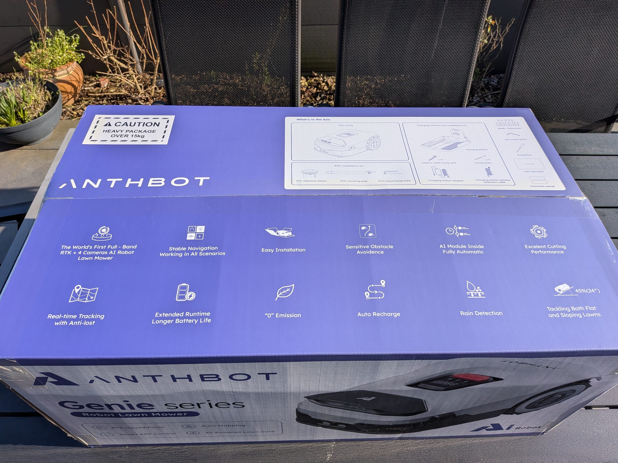 Der ANTHBOT Genie 800 wird in einem auffällig gestalteten Karton geliefert. Im Gegensatz zu vielen schlichten Industriekartons ist dieser farbig bedruckt. Das Design wirkt modern. Auf der Außenseite ist ein großes Bild des Mähroboters zu sehen. Zusätzlich sind verschiedene Funktionen und technische Highlights dargestellt. Dies gibt dem Käufer sofort einen visuellen Überblick über die wichtigsten Merkmale des Geräts.