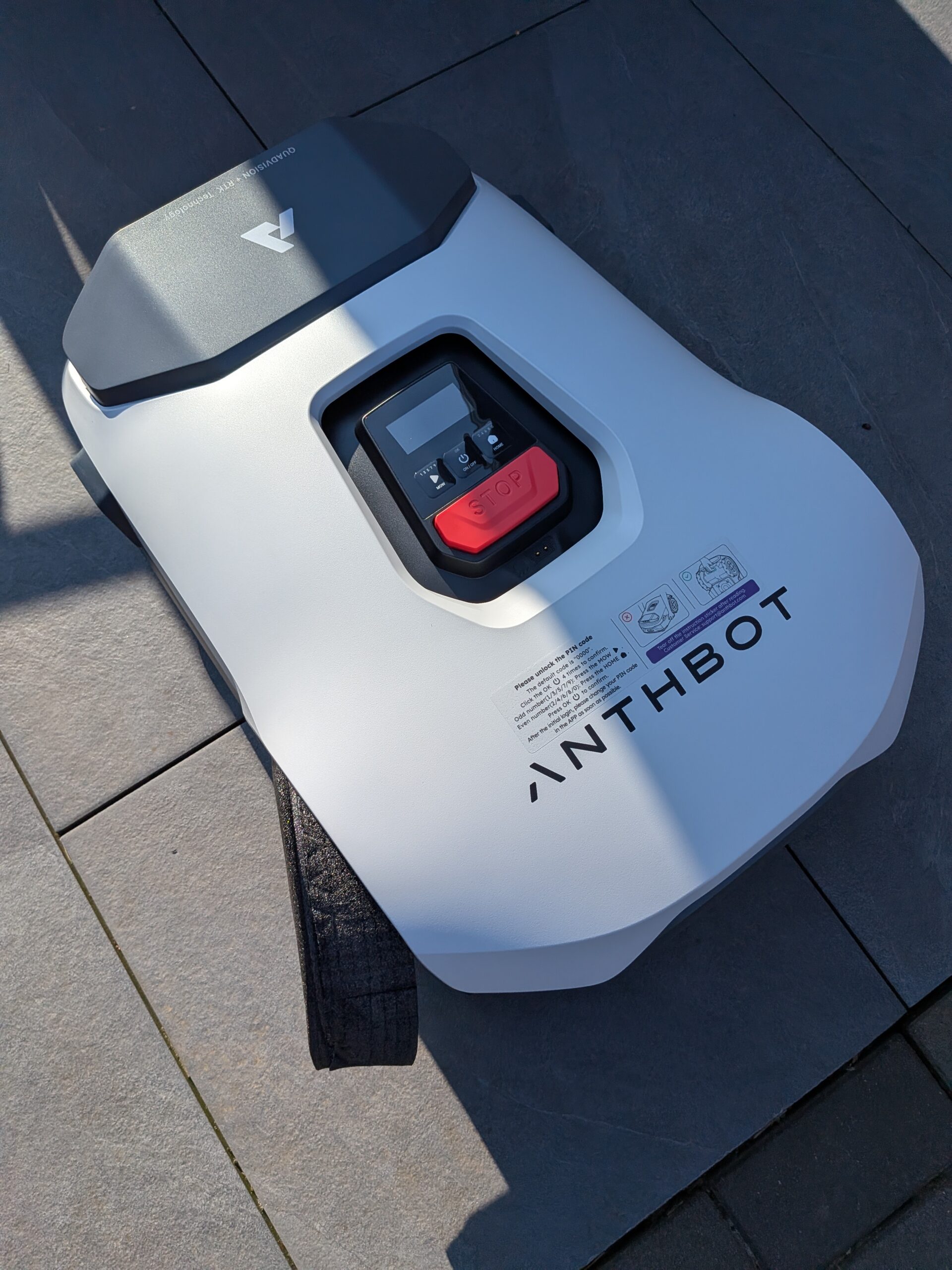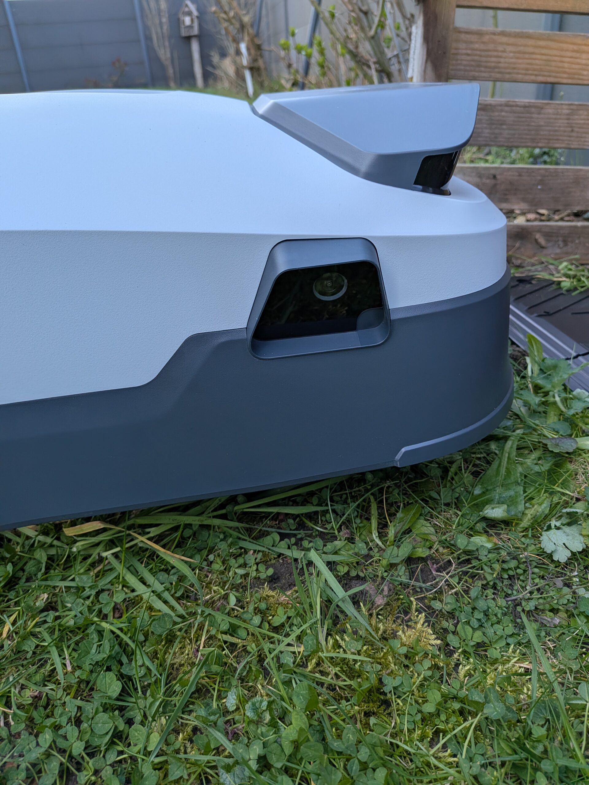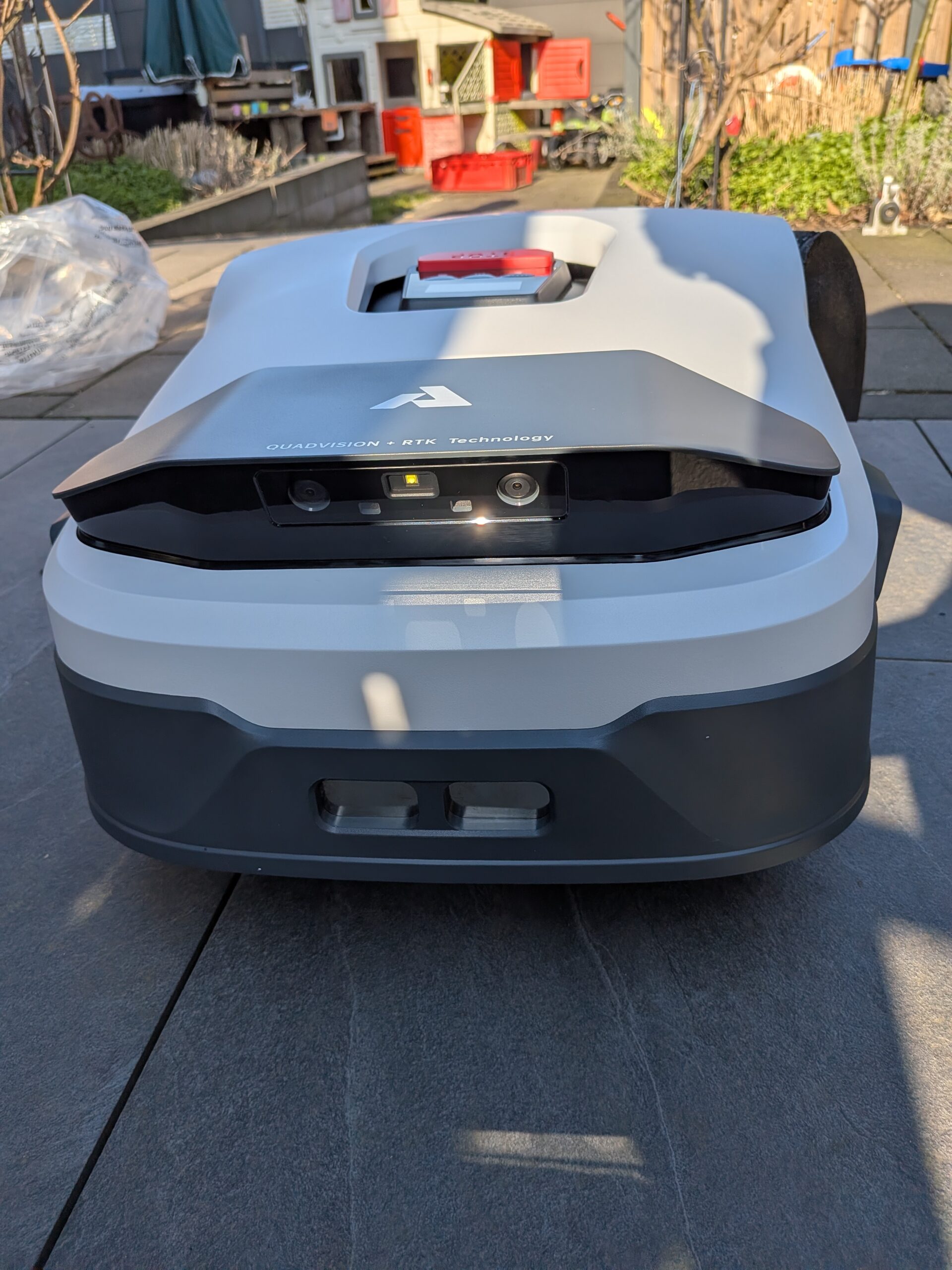 Ein weiteres auffälliges Designmerkmal ist das Kamerasystem. An der Vorderseite des Gehäuses sind markante Linsen verbaut. Diese Kameras sind so platziert, dass sie nicht nur den Bereich direkt vor dem Gerät, sondern auch die Seiten erfassen können. Auf der Oberseite befinden sich die physischen Bedienelemente. Das wichtigste Sicherheitselement ist der rote STOP-Knopf. Dieser ist groß, klar gekennzeichnet und von oben jederzeit leicht erreichbar. Ein Druck auf diesen Knopf stoppt alle Funktionen des Roboters sofort. Das ist besonders wichtig, wenn Kinder oder Haustiere unerwartet den Mähbereich betreten.