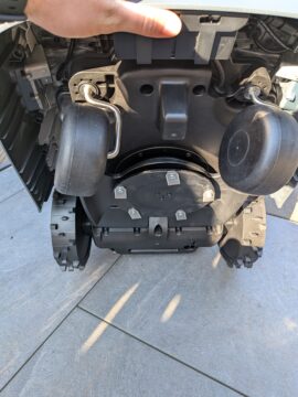Der Roboter fährt vorwärts in die Ladestation ein, wodurch die Sensoren zur Rückwand der Station zeigen. Laut Hersteller erkennt das Gerät beim Ausparken Hindernisse hinter sich. Dennoch bleibt festzuhalten, dass eine Ausrichtung der Sensoren nach vorne – mit Ladekontakten am Heck des Roboters – für mich persönlich als die bessere Lösung angesehen wird.