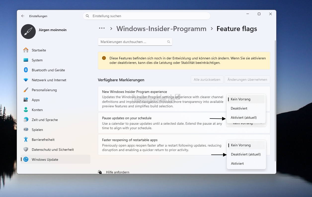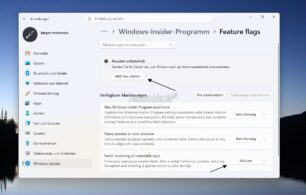 Wie hier bei den drei Flags, die voreingestellt sind, waren zwei davon schon aktiviert und eine Flag noch deaktiviert. Bislang hatten wir dann mit dem ViVeTool und einer bestimmten ID die Funktion freischalten können. Das klappt ab jetzt dann unter Windows Update -> Windows Insider Programm -> Feature Flags.