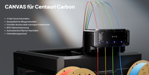 Elegoo erweitert sein Zubehörportfolio für den Centauri Carbon und bringt mit dem CANVAS ein neues Modul auf den Markt. Die Lösung ermöglicht erstmals Mehrfarbendruck direkt am Gerät, wodurch sich der Funktionsumfang des Druckers spürbar erweitert. Aktuell listet der Hersteller das System zur Vorbestellung, während der Versand für Ende Juni 2026 vorgesehen ist.