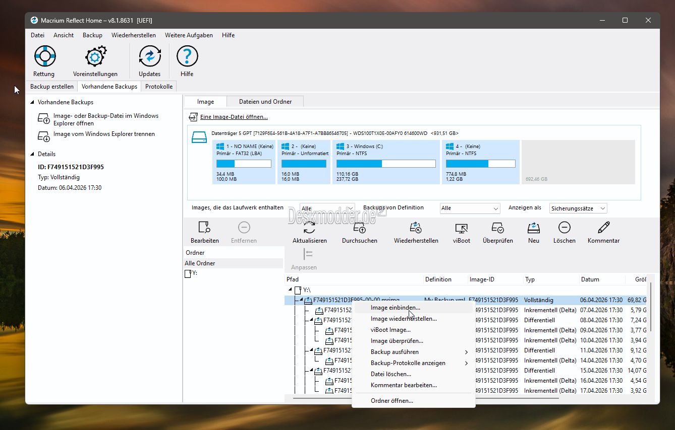 Nach einem Neustart kann man dann das Macrium-Image einbinden. Ist man damit fertig, sollte man die Änderungen in Windows Sicherheit wieder rückgängig machen.