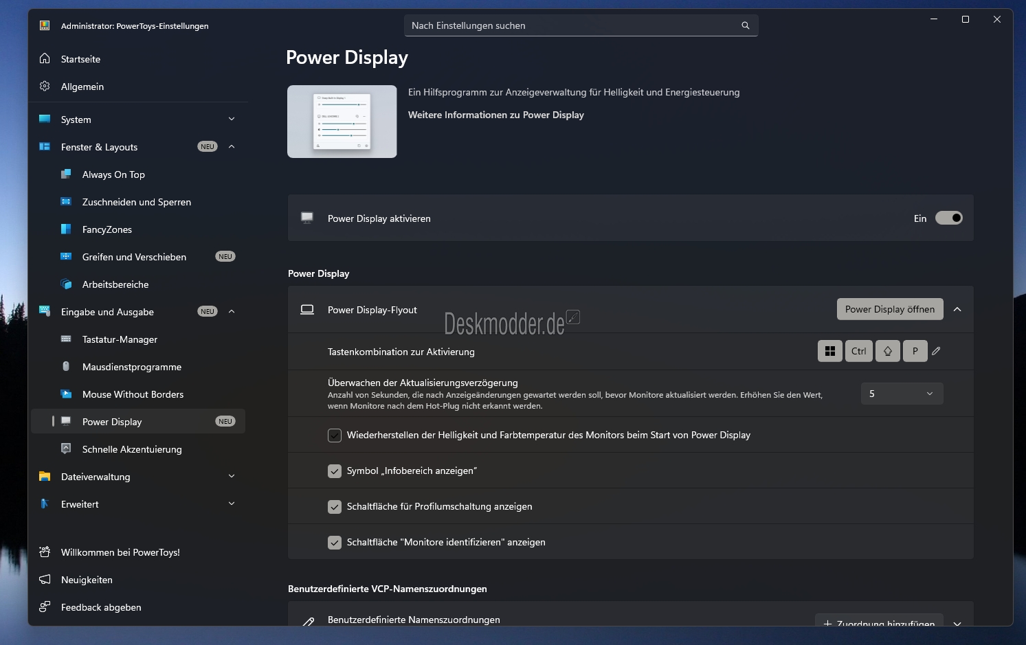 Die PowerToys sind mit einem neuen Update am Start. Heute wurde die Version 0.99 freigegeben. Neu mit dabei ist Power Display. Ein Hilfsprogramm zur Anzeigenverwaltung für Helligkeit und Energiesteuerung. In den Einstellungen zu finden unter „Eingabe und Ausgabe“.
