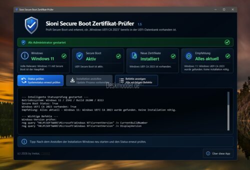 Mit den Skripten, die auf GitHub zum Prüfen angeboten werden, kommt nicht jeder klar. Daher hat Inekai ein kleines Tool mit einer grafischen Oberfläche erstellt. Er hatte mir vorhin eine Mail geschickt und mir das Tool Sioni Secure Boot Zertifikat-Prüfer vorgestellt, bzw. vorgeschlagen.