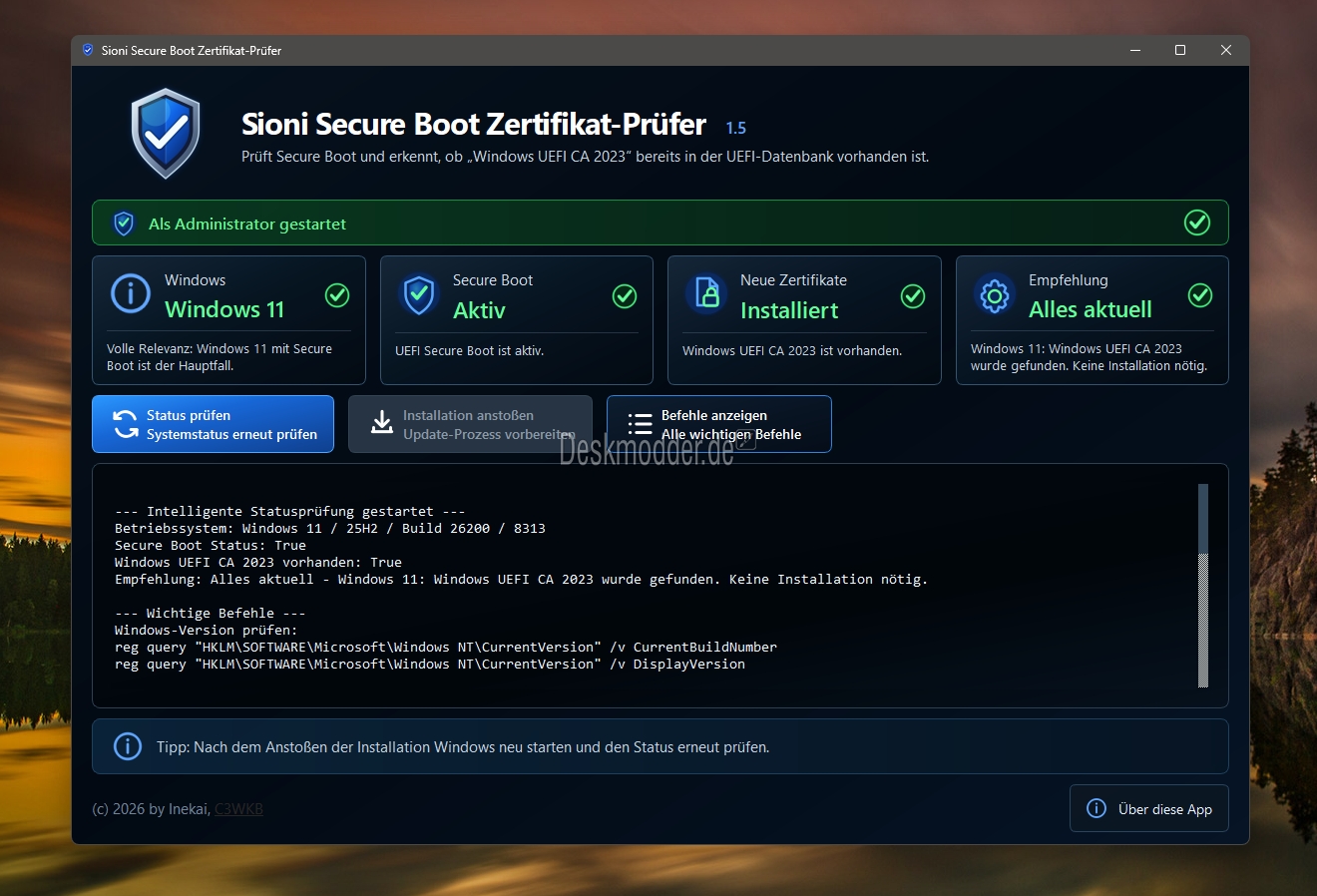 Wie man im Bild sehen kann, ist es wirklich gelungen. Das kleine portable Tool SecureBootCertChecker.exe muss nur mit Administrator-Rechten gestartet werden. Danach werden dann der Status abgerufen. Wer neugierig sein sollte, kann über „Befehle anzeigen“ auch den Ablauf des Checks nachverfolgen.