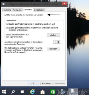 - Hier nun oben den Haken entfernen bei: Verwenden Sie das Startmenü statt Startbildschirm