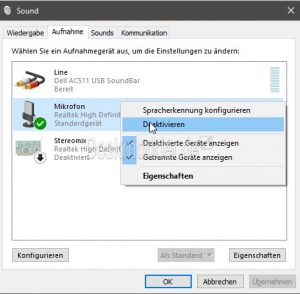 - Rechtsklick auf Mikrofon und dieses deaktivieren.